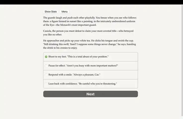 Steel, strategy, sabotage - or forbidden magic? How far will you go to defeat your greatest rival and win glory in the grandest tournament in the entire realm? Will you win back your honor or spark a revolution?Games of the Monarch’s Eye is a Silk Road inspired interactive fantasy novel by Saffron Kuo. It’s entirely text-based, includes hundreds of choices, without graphics or sound effects, and fueled by the vast, unstoppable power of your