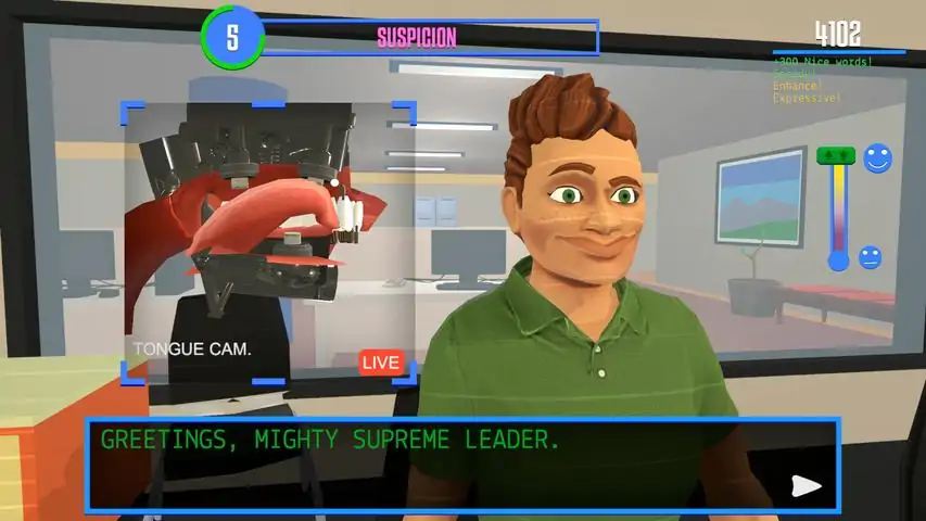 说话很难。你有没有一个对人类互动的模糊理解?好吧,这游戏就是为你准备的!你的任务很简单:渗入一个信任满满的人类世界,跟他们说话,并说服他们你绝对不是个机器人。恶心的人类语言艺术对我们来说是个谜。不知何故,只是挥动一个湿漉漉的舌头并咧咧嘴,就能说出词来。这到底是什么原理?我们不知道。但在这个模拟器里,如果不想脸部爆炸的话,你得学的快些。注意:如果犯了错,你的系统会过载,你的人工智能会被强制减压,其结果是导致一系列巨大的脸部爆炸和机械错误。对不起,这听上去不太安全,但在这种经济下我们不得不削减你的一些安全系统。在你升级你的技术过程中,你必须学会高兴时微笑,悲伤时皱眉。眼神接触也很重要,因为人类在讲一个悲伤的故事时,如果看到你直直的盯着他们并灿烂的微笑,会非常怀疑的。游戏特性从十种不同的社交场合当中顺利过关,包括工作面试,葬礼,体检和浪漫约会。用最新的社交科技升级你自己。学习如何微笑,扬眉,以及尴尬的从对视中看向别处,就像在现实生活中一样。游戏史上最真实的胡言乱语系统。游戏中的动态音频系统能对舌头和嘴巴的运动做出反应。可重玩性:在大量不同的脸部爆炸动画之下,每个对话都充满了滑稽感和独特感。美到窒息的舌头动画。经过微调的唾沫粒子效果。极富适应性的配乐,在不同的对话下有相应的变化。仔细打磨的对话和令人愉悦的叙述。委身参加人类的舞蹈。个性化你的机器人使之变成你自己的创造。一个对社交焦虑症出奇准确的写照。