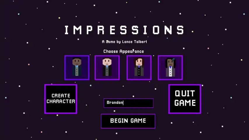 WE'RE NOT ALONE. HOW DO YOU FEEL?Become a news pundit for the popular news stream show, STREAM 47A. You and two others, Clark and Patricia, are tasked with commenting on the latest news story that's shaken the entire planet to its core. Aliens exist, and thus we are not the only intelligent life in the universe. One thinks this marks a new age for humanity, and the other believes this is the beginning of the end. But how do you take this revelation? Are you happy? Scared? Something in between? The whole world is watching you and hanging on to every word you say. The people's perception of the newly discovered aliens will be shaped by your opinions. Not only that, but the aliens themselves will almost certainly hear what you have to say. What kind of first impression do you want to leave?Impressions is a game about thoughts placed within the context of a science fiction short story. The game is split into four days, with each day starting by having you review the news of the day. Use this and some thoughts from people on social media to construct your own opinion on the discovery of aliens. When you're ready, the show will begin and you can broadcast your thoughts to the entire world. What you say will affect the story and world around you. Sometimes those consequences are felt immediately, and other times you don’t see the end result of your decision till much later. Think carefully but quickly. STREAM 47A won't wait around for you, so if you wait too long to answer the game will make a decision for