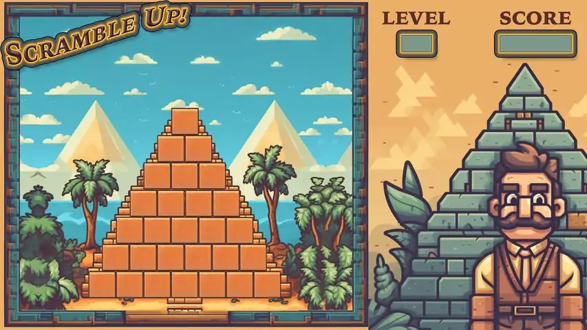 Scramble Up! is a fast-paced word puzzle game set against the backdrop of ancient Egyptian pyramids. Test your vocabulary skills as you ascend through a series of pyramids, rearranging letters to form new words on each level. Your goal? To scramble your way to the top, one word at a time, before time runs out!Game Overview:In Scramble Up!, you begin at the base of a pyramid with a word that has each letter occupying a block. As you move up the pyramid, you must rearrange all but one letter on the row above to form a new word, continuing this process until you reach the top. The game starts simple but quickly grows more challenging as the pyramids get larger and the words