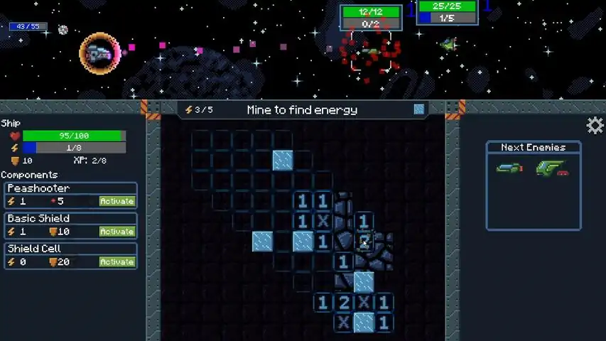 Turn-based strategy roguelike game combining reverse minesweeper with inventory management. Collect items, organize inventory, mine for energy and vanquish your foes!Gain new items and place them strategically in your ship. Each items have unique properties which may vary depending on their placement within the