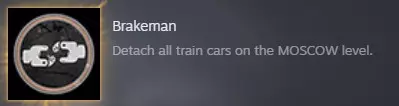 Moscow - Achievements【出埃及记】必须完成,不可错过;只需完成该章节。秘密成就:在章节的最后部分,当你需要潜入大型装甲列车时,在进入新车厢前,通过与左侧的杠杆装置互动来分离两节独立的车厢。