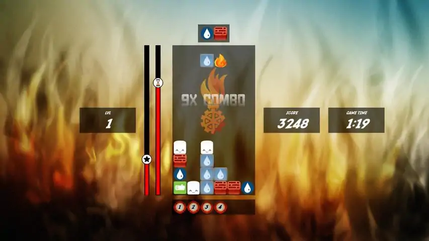Join the ranks of the volunteer fire department in Tübingen, Germany, and defend the city from evil-doers through arcade puzzle action!The Firefighter DuelRotate and drop the falling blocks to create reaction chains for big points! Fire ignites bombs, toasts marshmallows, and burns wood. Water extinguishes fire. Ice extinguishes fire and melts into water. Water, wood, and brick clear if five or more are