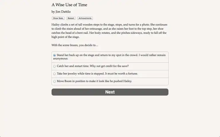 With the power to freeze time, you can ransack a casino, rescue a celebrity, or cheat death itself!"A Wise Use of Time" is a thrilling 260,000-word interactive sci-fi novel by Jim Dattilo, author of "Zombie Exodus," winner of the 2011 XYZZY "Special Recognition" award for interactive fiction. Your choices control the story. It's entirely text-based--without graphics or sound effects--and fueled by the vast, unstoppable power of your