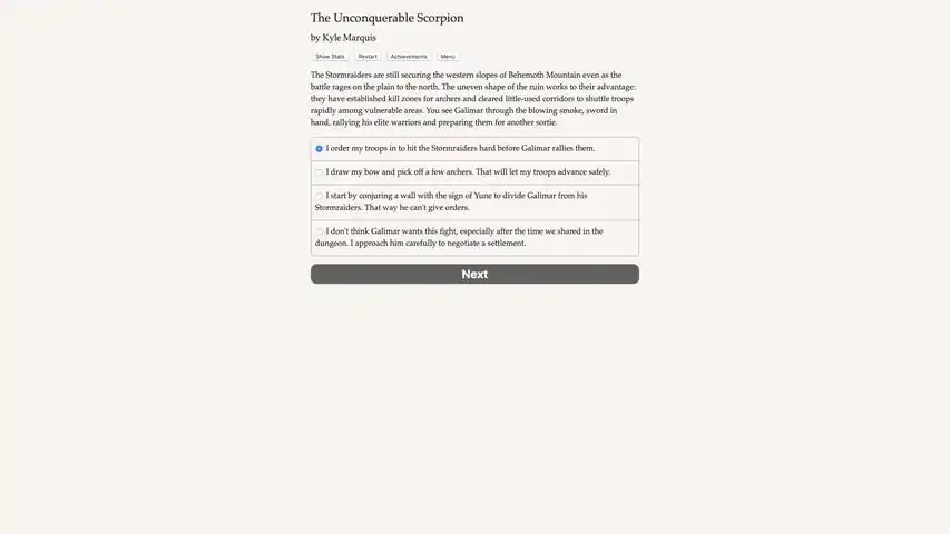 Chosen by the gods, betrayed by your king, you must stop the Scorpion!Pon Para and the Unconquerable Scorpion is a 742,000-word interactive fantasy novel by Kyle Marquis, and the sequel to Pon Para and the Great Southern Labyrinth. Your choices control the story. It's entirely text-based—without graphics or sound effects, and fueled by the vast, unstoppable power of your imagination. The philosopher witch Teijia has unleashed a new weapon: a scorpion-god whose venom poisons the very foundations of reality! As the edges of the world disintegrate, the nomadic Stormraiders make one final, desperate push to defeat the Three Nations and carve out their own