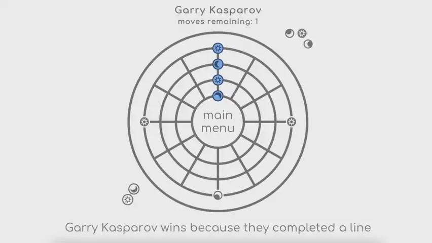 harmony is a strategy board game turned digital. the key philosophy behind harmony's design is simple to learn, but hard to master. in harmony you must out maneuver your opponent to make an alternating pattern without letting them leverage your own pieces against you. in harmony your goal is to make a pattern of four pieces in alternating states. this state can either be the face of the piece (sun, moon, sun, moon) or the color of the piece (dark, light, dark, light). this pattern must appear on a vertical line or one of the three outer rings. when on a ring the pattern can be in an arc, where all of the pieces are adjacent, or in a four corners arrangement, where the pieces are 90 degrees apart from each other. during a turn you are able to make two moves of your color or one move of your opponent's color. a move consists of either placing a piece, moving a piece, or flipping a piece. pieces can move any number of spaces in a single direction, but cannot pass through any other piece. there is no way to remove pieces from the board.