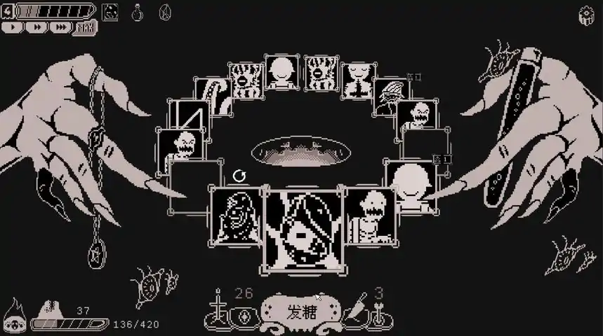 关注我们官方玩家交流2群:444273084官方玩家交流1群:102763907 (已满)关于游戏你又一次在梦中听见了低语。那粘腻的声音像是由无机质物发出的一般,吟唱着一长串晦涩难懂的音节。黑暗蠕动着,有视线从最深处投来。那是最为强大且不可名状的存在。最初足以将神经扯碎的恐惧已经化为了甘美的宁静,你在此刻明白了自身的使命。向那伟大存在献上贡品,祝祂挣脱牢笼,让混沌再次降临!发糖模拟器是一款肉鸽卡牌游戏,它的灵感来自于众多卡牌构筑类游戏,比如《幸运房东》,《杀戮尖塔》以及《怪物火车》。游戏通过卡牌收集为邪神献上的贡品,若没有在时限内攒够贡品,将会面临邪神的惩罚导致游戏失败。克苏鲁的世界是混沌无序的,因此卡牌也是以乱序的形式进入轮盘,每一轮都可能产生天差地别的结果。而对抗混沌的方式除了祈祷外,还有一种,那就是管理轮盘上的卡槽,只要一点小小的改变,就可以使卡牌发挥最大的价值。游玩过程中你会经历各种事件,以及获得各类卡牌,强大的神话怪物,卑微的人类祭品,支付贡品发动的邪道法术等等。除此以外,邪神赐予的遗物拥有改变游戏特性的能力。利用好它们来获得更多贡品吧!玩法特色:神话生物:众多克苏鲁怪物和邪神们组成不同的流派。轮盘:卡牌以乱序的方式进入轮盘,你可以通过设置轮盘上的卡槽来引导想要的结果。献祭:献上贡品以破除封印,使命是召唤邪神。事件:在克苏鲁风的事件中做出选择。