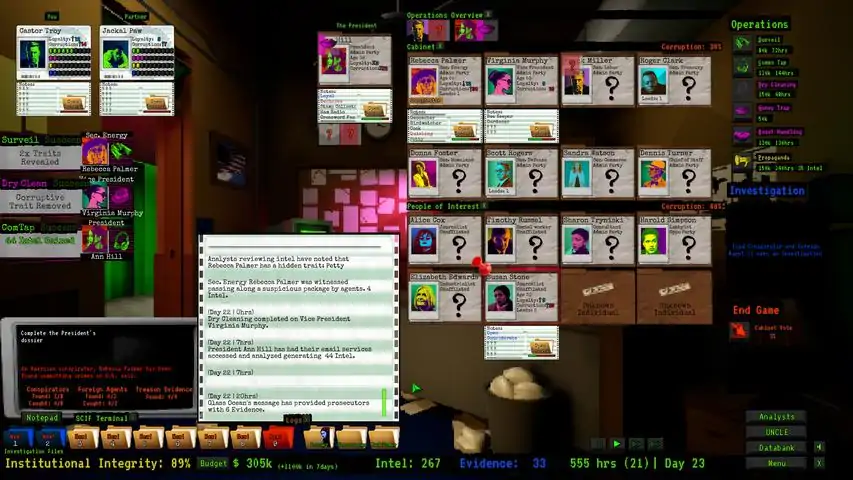 Are you smart enough to uncover rogue agents within the US government, outwit a corrupt administration, and uncover the truth:Is the President a Traitor?Race against the clock to stop the President and their conspirators from destroying the integrity of American institutions. Starting with only meager funds and dogged perseverance, you will conduct an intelligence investigation of the President’s circle of aides, advisors, and donors. Surveil targets,
