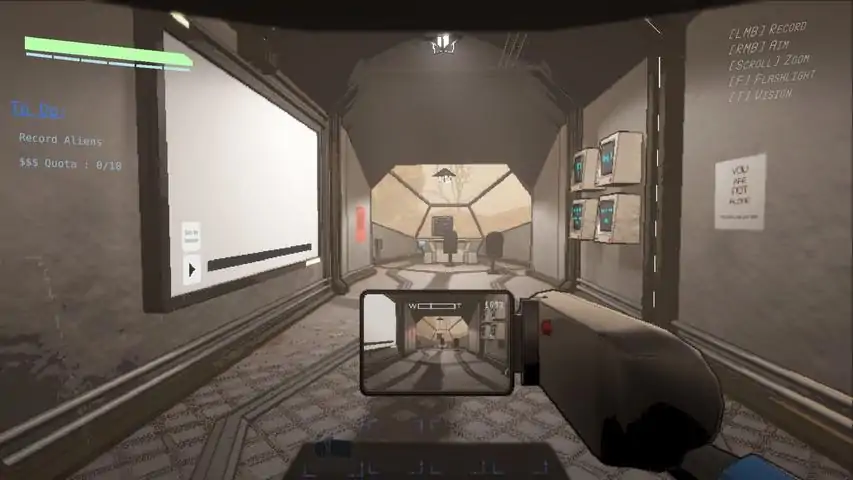 Welcome to the Colony. You've been assigned by the Colony to record evidence of unknown aliens with your Colony issued camera. Every day you will be given a new quota that you will need to satisfy. You will be given a certain amount of cash based off of your recordings. You can use your hard earned cash to buy helpful items from the shop located in your ship's terminal. You can buy and use things like bear traps and stun guns to set up traps for the aliens while you stealthily record