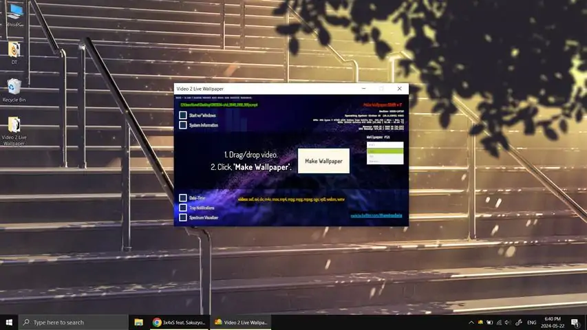 Video 2 Live Wallpaper is a free and easy-to-use app for Windows to play/set videos as live desktop wallpapers. Simply drag a video into the app window and click "Make Wallpaper" or press the Shift + F hotkey. That's it!Additional Features (optional toggles):- Image wallpapers.- Audio playback (from video).- Live spectrum visualizer -> pickup any audio playing on the computer.- Live system/hardware info -> print current CPU/GPU/memory stats.- Interactive date-time label.