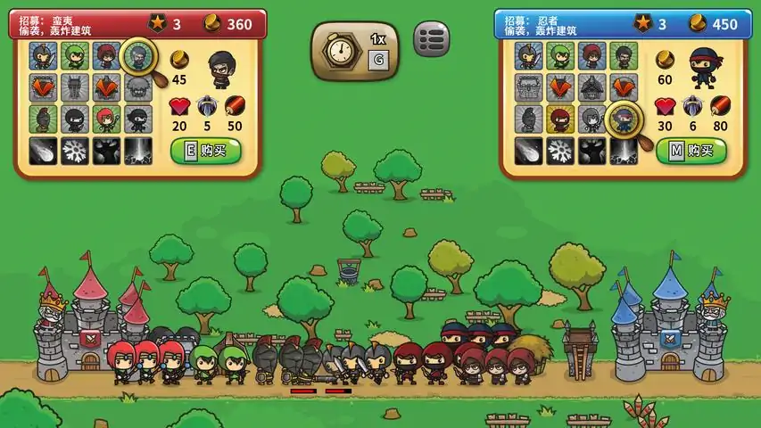 集结军队,夺回王位!或是在PVP的战斗中挑战你的朋友!剧情模式: 探索并夺回那被你曾称之为家的土地。 在任务中遭遇并招募盟友来消灭黑魔仙和他的随从。 攻占风车来获取战争中所需的黄金。战斗: 实时,快节奏的战斗将考验你的勇气。永不退缩,绝不撤退! 十二种不同单位和结构类型,每种都有其独特的用途和能力。 在你的指挥下对多样化的战士进行分层,利用敌军的优势和劣势来运筹,但要迅速计划。 在战斗中通过建造特殊建筑来支援和升级你的军队,让普通的士兵化身为战场上的堡垒。战略: 施放强大的法术来逆转战局,或者召唤强大的巨人来撕裂敌人的防线。但请注意:你的敌人也会使用远古魔法! 更喜欢用诡计?盗贼和忍者能绕过战斗,直击敌人的基础建设。 从电脑AI中学习,通过实时查看其策略执行情况。提升你的战术来取得胜利,并在最后的战斗中夺回王位!不同游戏模式: 在经典战役模式中对抗AI夺回王国,或者在一对一的竞争中挑战你的朋友。 用你期望的设置定制多人模式战斗,无论是小规模遭遇战亦或是全面战争。 两种难度模式:一种是随意体验的简单模式,另一种是游戏本身应具有的难度。用你喜欢的方式游玩: 你可以使用鼠标操作(点击以在地图上移动,点击购买单位/建造/施法) 您可以使用手柄(完全支持控制器) 你可以使用键盘(wasd或方向键移动,e或enter购买/建造/施法) 两个玩家可以在一个键盘上进行对战游戏(WASD代表左玩家,方向键代表右玩家) 所有按键均可配置 意念控制暂时不受支持,但可能在将来实现;)那么,我的王,你认为你有什么办法能够恢复王国,惩处叛贼,在你的命运上留下浓墨重彩的一笔?