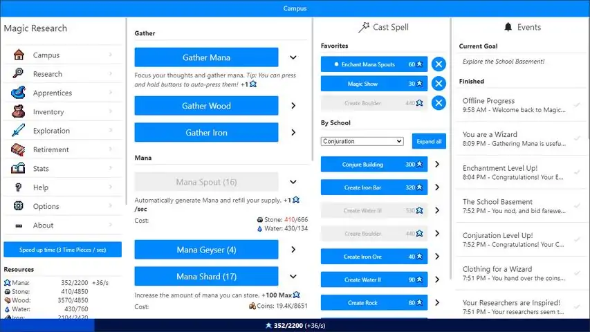 In Magic Research, you are the headmaster of a newly-created institution of Magic with one goal: to learn as much as possible about this power and get enough fame to be able to compete, and win, the prestigious competition of schools: the Tournament of Magic. But what will you discover along the way? Cast over a hundred different spells with various effects Research magic in various magical schools to discover new, surprising ways to use this power Accumulate resources and build the school campus Manage a team of researchers and apprentices to lead your school to fame Discover tons of hidden new features - when will you unlock the next one? Find over six dozen secret Storylines with permanent, game-altering effects Restart the game and make faster progress each time with retirement bonuses Over 40 hours of addictive gameplay!
