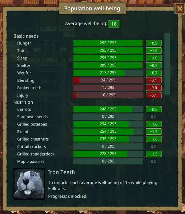 5) Food 101 - Early berry patches will not last you, get a farm up immediately after building the dam. beavers need 2.5 food per day, but droughts can kill your plants and you'll need a safety net of food stores. However, to fulfil Wellbeing you need all three foods, say hello to future planning fun. And a lot of math if you want to optimise...