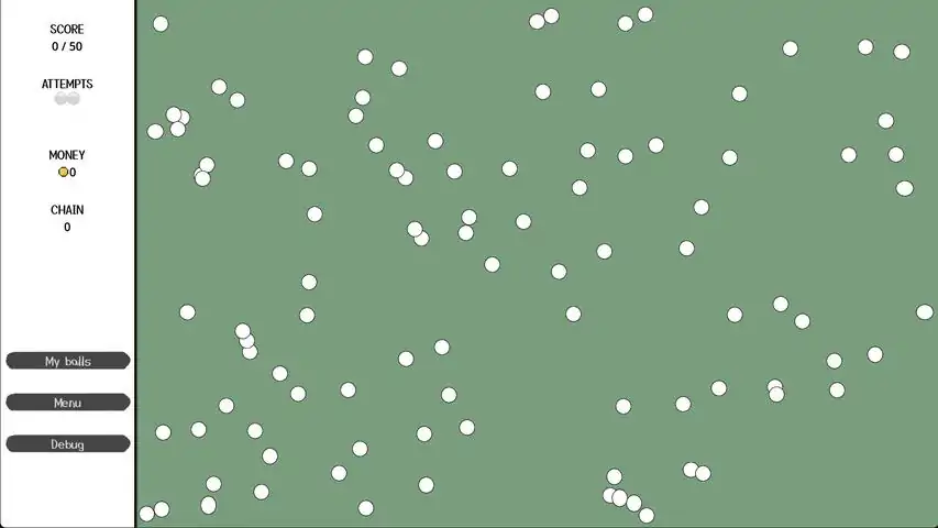 balls is a chain reaction game with deck-building mechanics in which you embrace chance and chaos to hit the ever-increasing target score. Start with a small explosion and watch how the reaction extends!A casual roguelite: the game can be played in short runs and does not require a lot of focus.A deck-building game without a deck: the randomness and chaos of the game is directly derived from the bounciness of balls in screen. No decks, no shuffling!Build the perfect combo machine: combine powerful special balls to try and build the perfect combo. Use spawner balls to add more balls to the field, power-up balls to buff nearby balls, or build-up balls that get more powerful the longer the chain reaction goes.