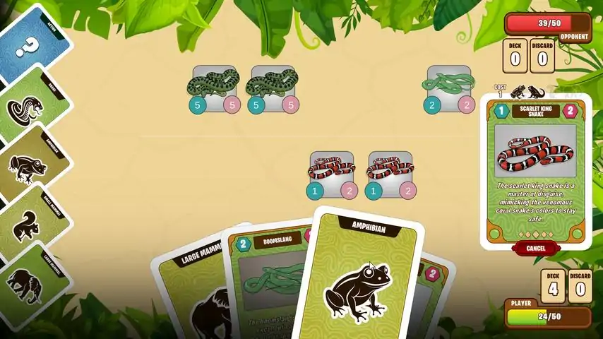 Molt is a turn-based deckbuilding card game in the vein of Hearthstone, Dominion and Wingspan. It aims to be educational and fun, with realistic depictions of snake species. Battle your friends or an AI opponent by choosing and playing a fleet of snakes, feeding them the appropriate food, and using Action cards to upgrade, heal and introduce various other disruptions to your opponent.