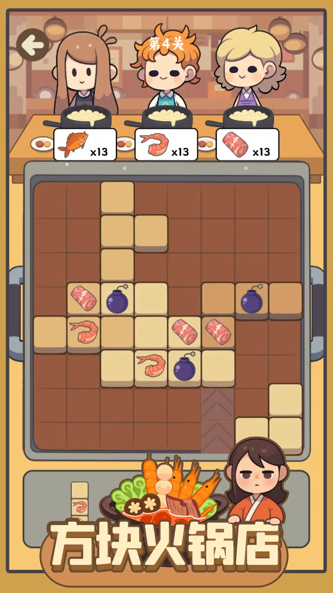 这是一款消除方块经营火锅店的游戏,游戏中玩家需要根据顾客需要的食材摆上积木,消除整行或整列的方块,满足顾客即可获得奖励升级店铺,把小店经营的越来越火爆吧。