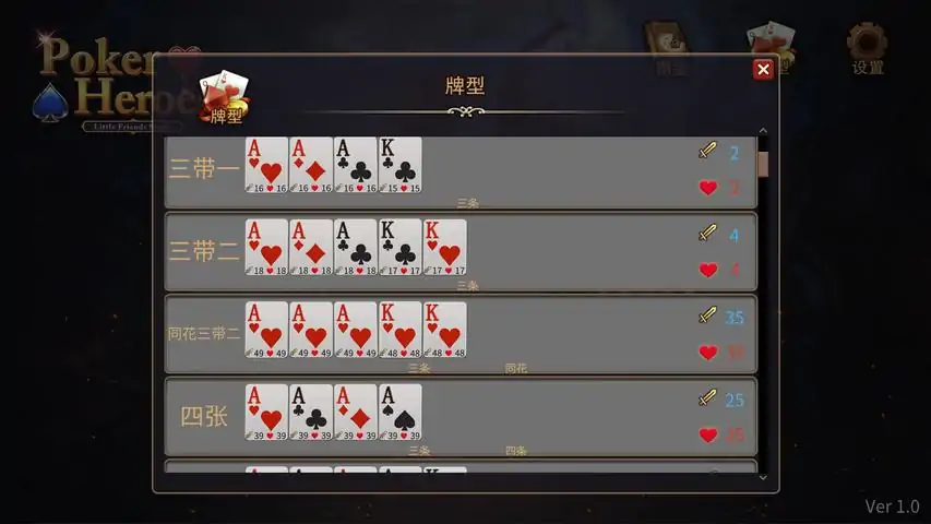 扑克英雄 (Poker Heroes)在扑克的牌局中,英雄的命运由你一手掌控。《扑克英雄》是一款休闲异步策略游戏,将经典扑克牌型与英雄养成巧妙融合。你将组建英雄小队,通过巧妙的牌局布局展开对决——无需实时等待,随时匹配对手,享受策略的乐趣与命运的惊喜。休闲模式轻松上手,天梯模式层层挑战,适合短时放松或深度沉浸。核心玩法:牌局策略,英雄觉醒养成与准备:从商店获取英雄、塔罗牌与遗物,调整小队阵容,构建牌局框架。融合牌型组合与塔罗遗物效果,预设你的战斗节奏。异步对决:进入系列赛模式,小队自动轮流出牌,牌局演变为英雄间的命运博弈。英雄技能触发特殊响应,逆转战局,考验你的布局智慧。神秘升级:塔罗牌与遗物系统带来随机惊喜,逐步解锁英雄潜力,探索无限策略可能。轻松上手,策略无限——扑克英雄,等你翻开牌局!