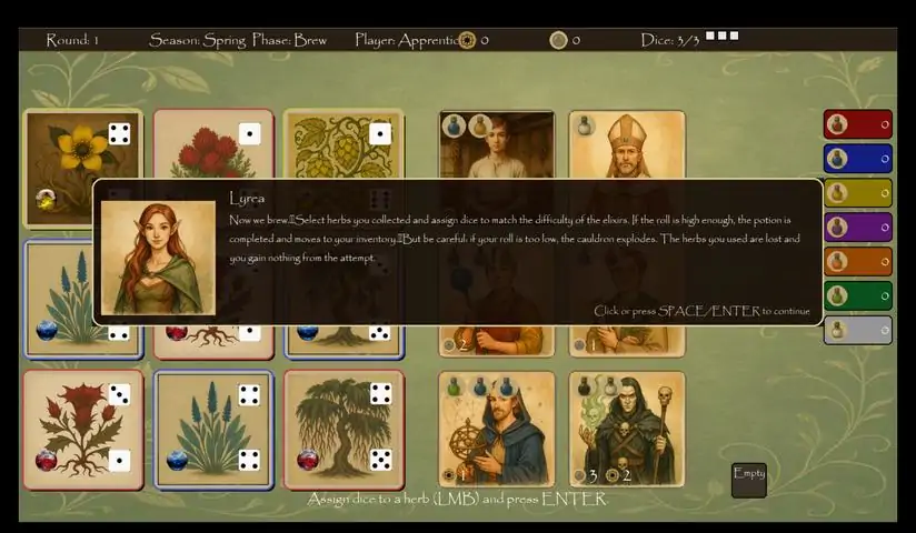 Mystical Herbalists is a fantasy board-game-style experience where you step into the role of a wandering alchemist. Explore enchanted meadows, gather unique magical herbs, brew potent elixirs, fulfill customer requests, and uncover the secrets of the mischievous goat-demon