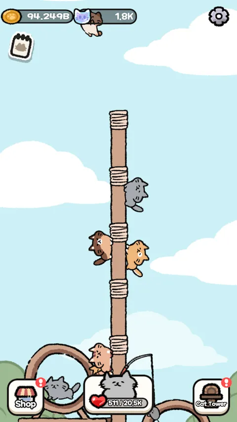 你的第一座 *猫咪塔* 已经准备就绪! 装饰你的猫咪塔,提升它的魅力值,并收集各种可爱的猫咪! # *游戏特色* # * 吸引猫咪的特殊猫咪塔* - 提升猫咪塔的魅力值,吸引更多猫咪。 - 根据你的设置,还有机会遇到稀有猫咪! # * 爬到塔顶,纵身一跃!* - 猫咪会爬到塔顶,然后跳下来,同时与各种模块互动。 - 看它们以最萌的方式翻滚、滑行、弹跳和碰撞! # * 互动变现* - 每次猫咪与塔上的模块互动,你都能获得金币! # * 发展与策略乐趣* - 使用你的金币升级猫咪塔,并收集具有独特效果的模块。 - 策略性地放置和组合模块,最大化你的收益!