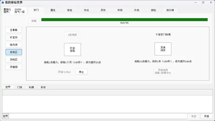 游戏介绍此游戏是由作者(策划)和另一位小伙伴(程序)合作的第一款商业化游戏,游戏设有内购,但不贩卖任何影响游戏平衡的道具。我们的初衷是打造一款支持挂机、自由交易、自由学习搭配功法、自由加点的修仙游戏。因条件有限,游戏未经过专业测试,可能存在 BUG 等诸多不足之处,希望大家见谅。对于提供优化建议以及反馈 BUG 的玩家,我们会提供丰富的资源补偿,期待大家一起努力,把这款游戏做得更好。温馨提醒:这是一款多人在线的文字网游,并非单机游戏!游戏主打上班挂机修炼,闲暇之余可以挑战 BOSS,通过历练、探索秘境等方式获取各种装备、法宝等资源;同时支持自由聊天(禁止一切涉黄、低俗之类的言论,违者将被禁言或封号),玩家可自由上架出售战利品。官方群:764923005欢迎大家留下宝贵的意见,有趣的玩法我们都会添加上去,发现的错误我们也会及时修改,希望能和大家一起完善这款游戏!功能玩法加入宗门游戏内设有四大宗门,每个宗门初始会赠送一本独立的宗门心法(心法效果如下),其他方面比如功法以及装备等方面的培养四大宗门并无差异,宗门也只是初期给玩家一个明确的培养方向而已。问剑山:提升暴击与爆伤赤霄门:提升火雷元素属性和抗性流云阁:提升水土元素属性和抗性灵宝堂:提升法宝属性效果宗门主事殿可在执法长老处捐赠资源,提升宗门等级和个人贡献,也能在此处晋升自己在宗门的地位,从杂役弟子逐步提升至核心弟子。可在考核长老处完成宗门任务,赚取个人贡献;也可以参与宗门大比,根据自身身份选择外门大比、内门大比、精英大比等赛事,努力击败其他玩家取得更好名次,赢取排名奖励。宗门珍宝坊可使用个人贡献兑换各种入门心法、功法以及药材、丹药等;也可使用充值货币仙玉,购买各类功能道具和时装装扮等。宗门炼丹房可在此炼制所需丹药,丹药可用于增加属性修为、突破境界瓶颈等。炼丹需满足对应的炼丹等级,解锁特定丹方,同时必不可少的还有炼丹所需的材料。宗门洞府这里是玩家挂机打坐修炼的核心区域,可通过提升洞府等级获得更快的修炼速度(需满足对应的宗门职位要求)。针对时间有限的玩家,游戏还提供了十倍秘境功能以快速修炼,开启快速修炼需消耗宗门秘境令(根据宗门职位,每日可免费领取一定数量的秘境令)。宗门历练区修为达到指定境界即可开启对应的历练区域,进入区域后通过翻格子的方式进行探索,有机会发现灵石、装备残片、法宝残片、天材地宝、药材等资源;若探索中遇到妖兽,可选择击杀妖兽获取装备道具。温馨提醒:每个历练区域共有 6 层,需清理完本层所有妖兽才能进入下一层。宗门灵植园每位宗门弟子初始拥有 10 块灵田(灵田数量将随宗门身份逐步解锁),每块灵田均可提升等级,灵田等级越高,可种植的灵药等级也就越高。装备玩法装备共分为 10 个阶段,每个修为大境界对应一个阶段;每个阶段有 16 件装备,其中包含 6 件武器和 12 件防具。每件装备又分为下品、中品、上品、玄品 4 个品质等级。装备包含主属性和词条属性,主属性可进行强化,词条属性则可进行洗练。玩家可完全根据自身培养方向选择装备和词条:例如走土属性功法的玩家,选择盾牌武器更为合适,因为土属性功法的伤害计算以自身防御力为依据,防御力越高,对敌人造成的伤害也就越高,词条可选择洗练气血属性、物防属性、法防属性等;而学习剑系功法的玩家,则可选择剑、大刀、长枪等武器。一切均基于玩家的培养路线而定,游戏本身无任何限制。法宝玩法法宝的设定与装备类似,同样分为 10 个阶段和 4 个品质等级,支持强化和洗练。不同之处在于,法宝需达到特定修为才能开启,使用时也会受到修为和真元的限制。法宝分为攻击法宝和防御法宝:攻击法宝每隔一段时间消耗真元主动攻击敌人,防御法宝则可为玩家提供护盾保护。这意味着,当你的攻击法宝足够强大时,战斗中无需亲自出手,法宝即可帮你消灭敌人;同样,若防御法宝足够强大,敌人可能无法破开你的护盾。功法玩法游戏内提供了几十种心法和功法,分为 5 个等级,等级越高,功法效果越好。玩家学习任何功法、心法均无任何限制,可完全自主搭配。需要注意的是,心法为被动效果,学习后即时生效;功法则需进行装配,装配后才能在战斗中使用,每位玩家最多可装配 6 本功法。功法按属性分为剑系(物伤)、火系(法伤)、雷系(控制)、土系(防御)、水系(治疗辅助),组队状态下可协调作战。游戏中的所有功法均通过系统产出,稀缺功法则由对应的世界 BOSS 随机掉落。集市玩法所有玩家均可在拍卖行购买或出售材料、道具,支持自由交易,无任何限制,同时支持玩家搬砖。若运气好在 BOSS 战或秘境 BOSS 挑战中获得玄级法宝、装备,或是天级、神级功法等稀有物品,可通过拍卖行卖给其他有需要的玩家,获取大量灵晶,灵晶可在拍卖行自由交易。特别注意:为保护玩家利益、维持游戏良好的交易环境,对于任何大规模使用工作室账号牟利的玩家,我们将直接永久封禁。其他玩法聊天、切磋、人气、魅力、称号、时装、排行榜、灵轮等玩法,这里不再一一介绍,欢迎各位玩家在游戏中自由体验!