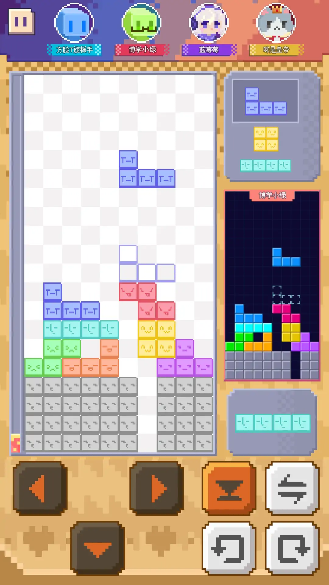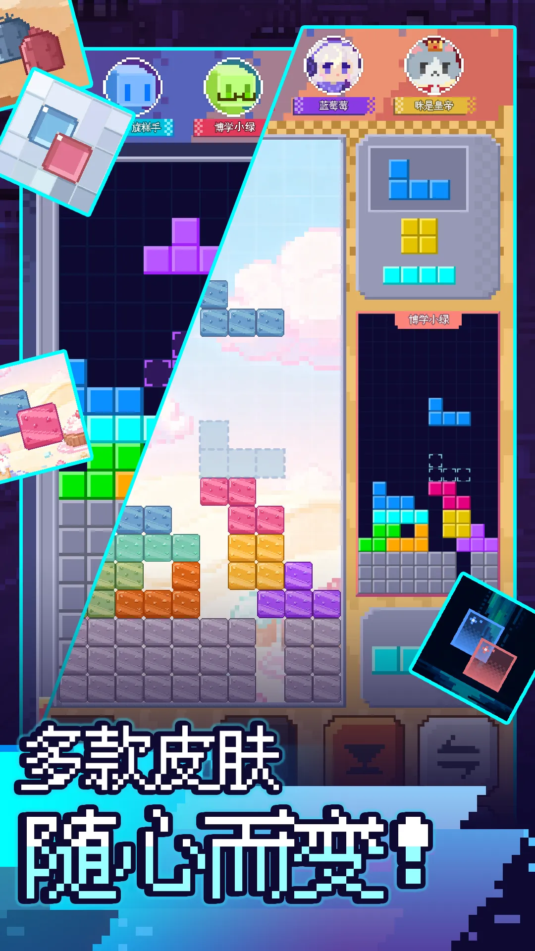 经典俄罗斯方块的联机对战玩法,多种方块皮肤等你来解锁! 如果你是专业竞技玩家,现代规则轻松玩,7种方块随机掉落,超级旋转 + 暂存功能+自定义按键,让你秀出最炫操作,冲击最强段位; 如果你是社交娱乐玩家,可实时匹配好友或其他玩家,消得越多越能给对手塞“捣乱方块”,看谁先被方块堆到顶; 如果你是怀旧休闲玩家,精美像素画风,经典单人模式,带你重温一个人偷偷躲在被窝里玩游戏的童年回忆。 总之,不管是摸鱼打发时间,还是和朋友PK 较劲,都能在噼里啪啦的消除声里玩到上头,快来用方块“拿捏”你的对手吧!