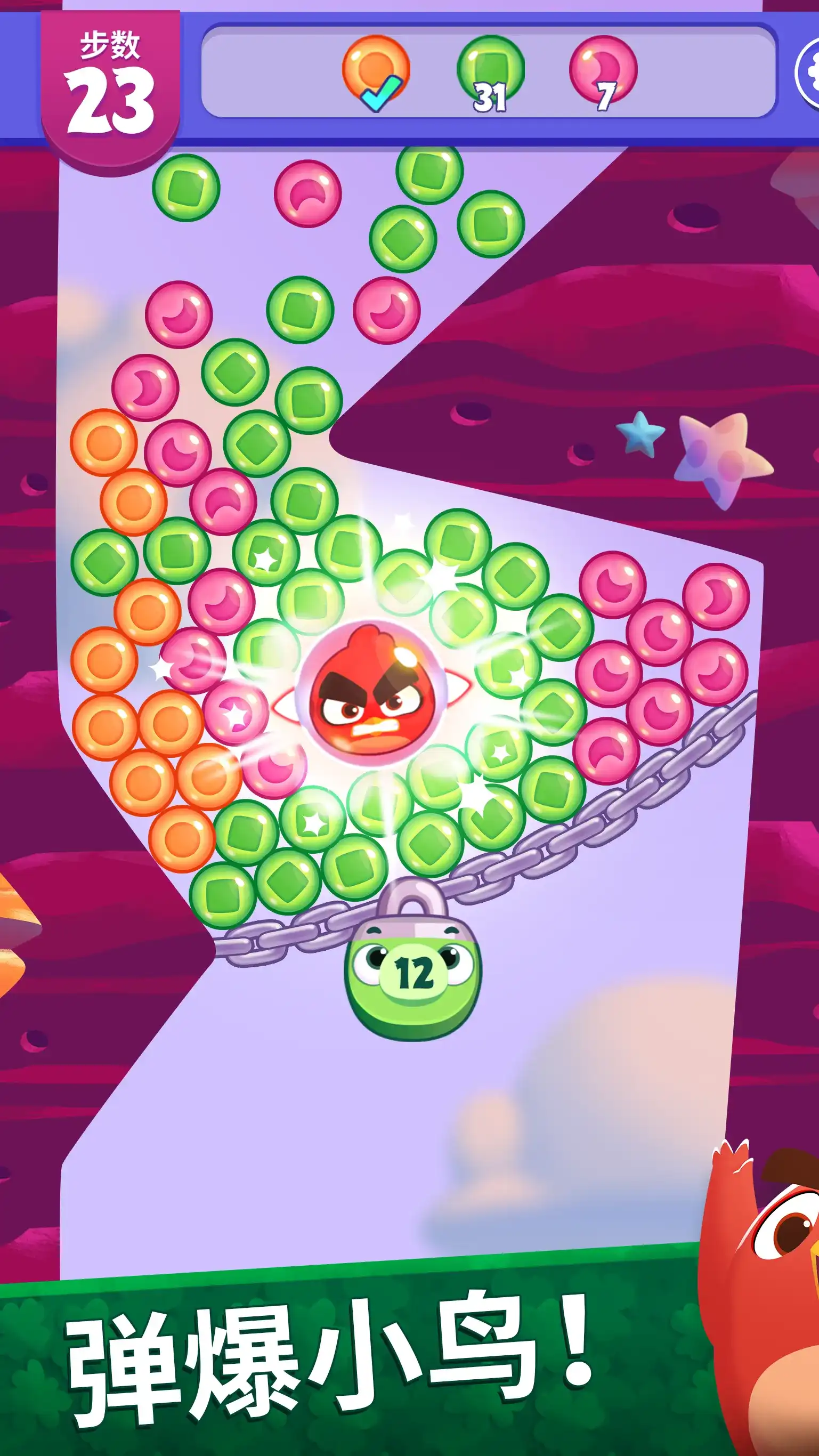 与可爱的幼年愤怒小鸟一起进入梦幻般的泡泡爆炸大冒险! 弹出梦幻泡泡,让你最喜欢的Angry Birds角色释放强大的爆破力。 在这个泡泡爆炸大冒险中,发现精彩地点,解决无尽的谜题,并体验激动人心的活动。 《愤怒的小鸟梦幻爆破》的特色是以下史诗级内容: – 可爱的角色和卡通动画,引导你穿越一个古怪的幻想世界 – 轻轻松松,随时随地游玩的泡泡爆破解谜游戏 – 弹出并粉碎梦想泡泡,让你最喜欢的Angry Birds角色释放特殊力量并解决谜题! – 与可以一路帮助你的好友组队! – 超过5000关有趣的谜题等待解决!挑战自己以实现梦幻颠峰 点击以弹出匹配的梦想泡泡。 匹配四个或更多可以创建怒鸟红。结合两个怒鸟红可获得飞镖黄,而两个飞镖黄可获得炸弹!匹配越大,爆炸就越大。