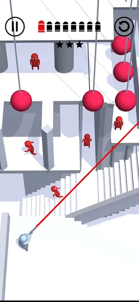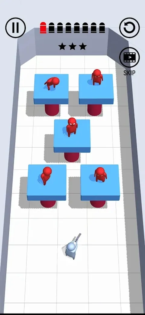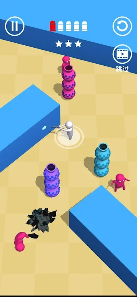 一款小角色射击策略游戏,玩家需要控制角色的射击角度,在限定次数内击败所有敌人。力争以最少的尝试次数获得最高评价。