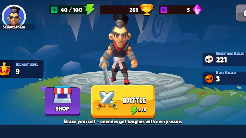 欢迎来到《武士萨姆》,这是一款快节奏的手机动作游戏,每一次挑战都是对技巧、反应速度以及武士极限的考验。 击退一波又一波的骷髅大军,完成地图目标,解锁全新挑战,并通过永久升级不断强化你的武士。 ⚔️ 快节奏、技巧至上的战斗 掌握一套易于上手且极具挑战性的战斗系统: 连击奖励精准的时机把握和积极的进攻 冲刺可让你迅速脱离险境并重新定位 远程攻击可让你从远处惩罚敌人 格挡系统——完美时机即可将伤害反弹回敌人 强大的特殊攻击,助你在被包围时清场 每一次攻击都力求带来极致的爽快感:流畅的动画、强劲的打击感、身临其境的特效以及升级的音效设计 ️ 地图 + 目标(不止是无尽的波次) 完成地图目标和波次里程碑,不断推进游戏进程 完成任务即可解锁下一张地图 深入《武士武士》的世界,挑战更强大的敌人