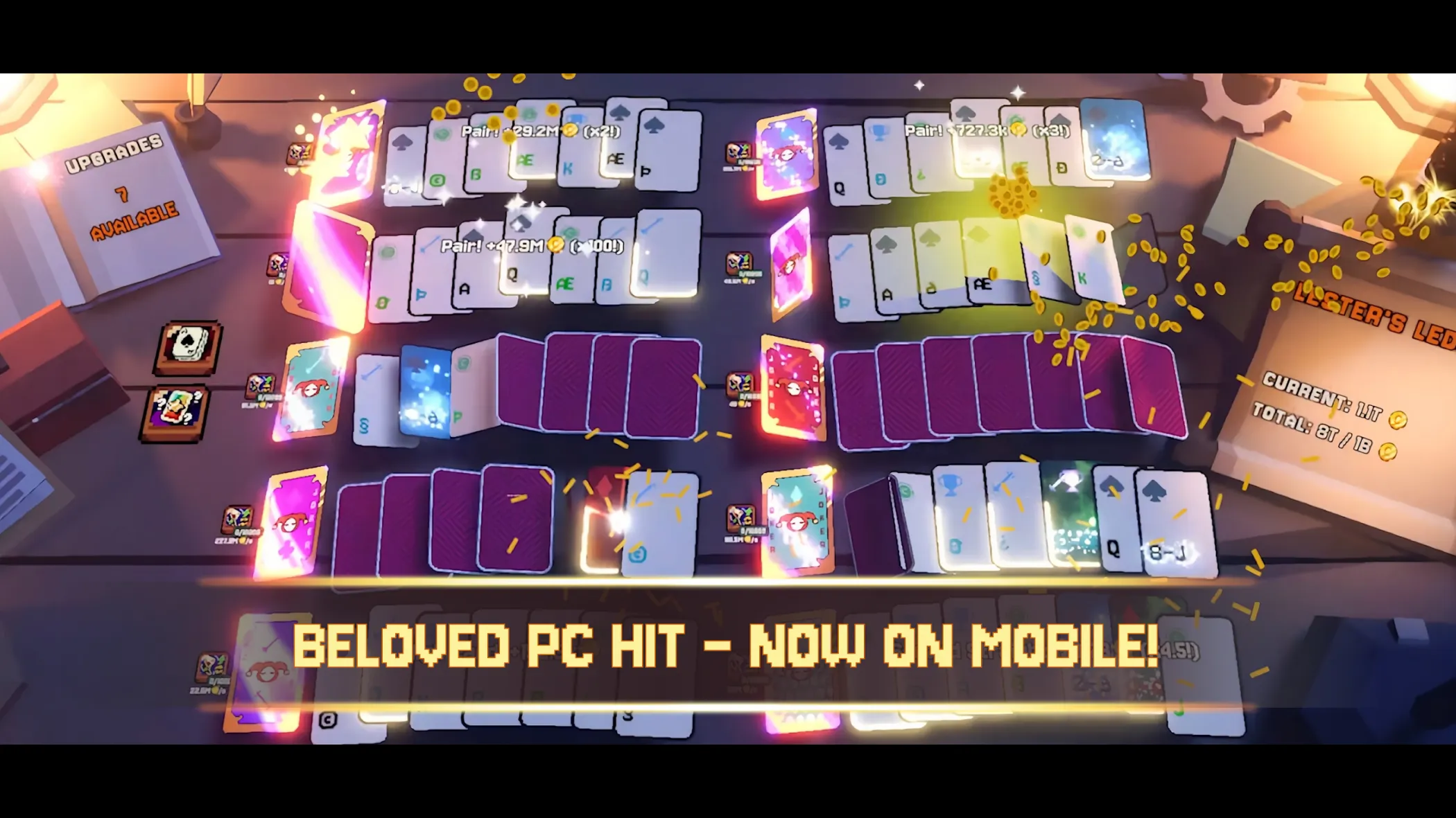 欢迎来到翻天喜地凑大钱 - 这是一款特别的放置增量点击游戏,翻牌赚钱,扩充手牌,购买一副又一副牌,解锁强力升级项目,发现新牌,等等等等。你能打败小丑,逃离嘉年华吗? Steam:特别好评,89% 扩充手牌 入手新牌,提高你翻出一手好牌的几率。如果你足够有钱,甚至可以打破规则,让手牌突破5张的限制。 掌控局面 尽管小丑不喜欢,但你可以继续买一副又一副牌,让你每次能够翻出更多手牌。善用这一点,你的收益会涨得更快! 不断升级 用你辛苦赚来的血汗钱购置强大的升级项目,加快成长节奏,开辟新的路径,最终面对邪恶的小丑! 远征探险 解锁之后,可以派你的随从外出探险,发现效果强大的异牌。随着游戏推进,远征任务升级之后,还能提供更为丰厚的回报。甚至可以解锁任务销毁你不想要的牌,从而确保每一手牌都如你所愿。 登峰造极 与小丑做个交易,重头开始,以换取扑克筹码(扑克筹码?可这又不是在打扑克……?),然后用筹码购买更加更加强大的升级项目。 逃出纸牌屋 你困在了小丑的地盘,能否打败他,成功脱身?还是他会把你永远禁锢在无休无止的轮回之中?