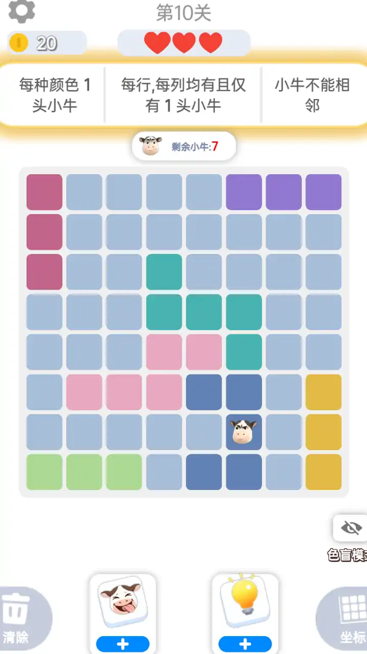 本游戏是一款逻辑推理 + 解压的爆款小游戏,核心是在网格里按规则找出 所有 “牛” 的唯一位置,画风治愈、节奏轻松,适合碎片时间玩。