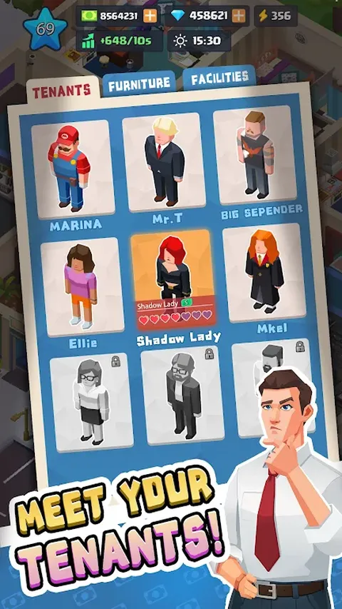《闲置公寓大亨》邀请玩家扮演一位精明的房地产大亨,在这里,战略决策与悠闲的游戏玩法相结合。从一个不起眼的公寓大楼开始,将其改造成一个欣欣向荣的帝国 - 即使离线也能获得奖励! 游戏特色: [放置 & 策略经营] - 平衡简单的点击升级机制和深入的战略选择。自动收取租金,扩建房产,优化租户满意度,实现利润最大化。 - 引进现代设施(例如健身房、屋顶花园)并雇用员工以提高建筑物的吸引力。 [多样化的租户和故事] - 结识具有独特背景和需求的古怪租户—从寻求工作室的艺术家到需要儿童友好空间的家庭。他们的故事通过互动任务展开,增加了叙事深度。 - 解决冲突(例如噪音投诉、维护危机)以赚取忠诚度奖金并解锁稀有奖励。 【自定义你的帝国】 - 使用数百种装饰选项个性化公寓,从复古别致到现代简约。升级大堂、阳台甚至室外空间,吸引高薪租客。 - 选择你的房东生活方式:开豪车,购买顶层公寓,或投资邻近的房产,称霸房地产市场。 【探索动态地图】 - 扩展到城市之外!解锁沿海度假胜地或城市热点,每个都有独特的建筑风格和租户人口统计数据。