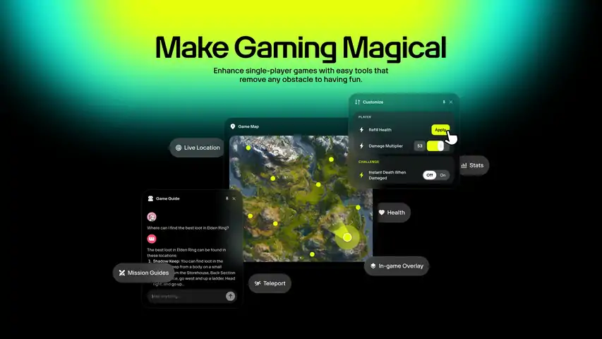 # Wand is a comprehensive desktop application that enhances single-player experiences for millions of gamers. - Personalized Gameplay: Customize difficulty, progression, and resources to match your playstyle. - Game Help: Navigate challenges with interactive maps and receive AI-powered guidance tailored to your specific in-game situations. - Seamless Integration: Works alongside your library with support for over 3,500+ games, an intuitive interface, and regular updates for new titles.