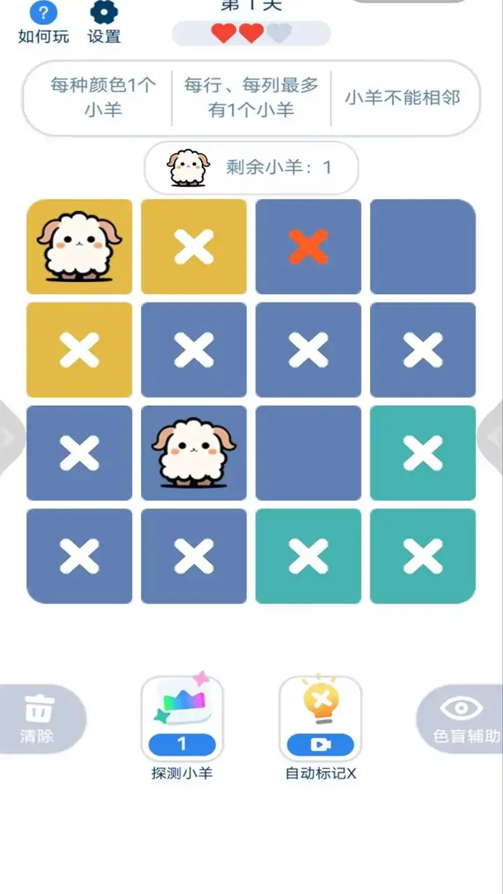 在游戏中,游戏规则类似数独与扫雷的结合:在网格中放置小羊,每种颜色只有一只,且小羊不能相邻(包括对角)。请你根据颜色分布推理位置,例如某颜色只剩一格时该位置必有小羊,放置后可排除其所在行和列的其他格子