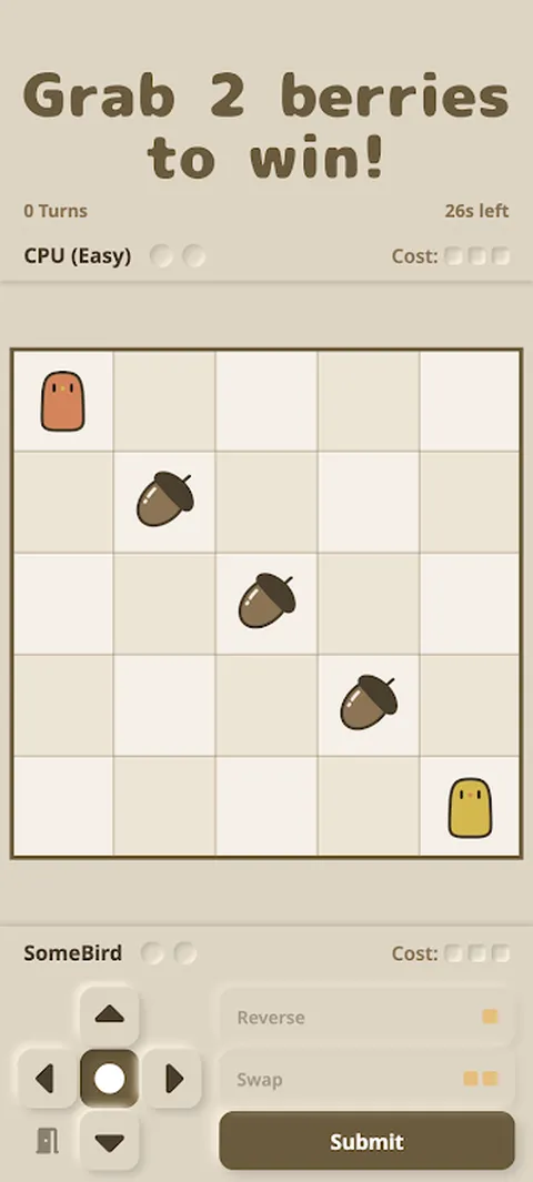 简单却又深刻!享受棋盘上展开的智力游戏! ■ 规则 最先收集 2 个浆果的人获胜! 选择你的方向和技能,然后同时揭晓! 你能读懂对手的动作吗? ■ 3项专项行动 ・反向 ― 改变方向 ・交换 ― 与对手交换位置 ・重叠 ― 当重叠时,分数会交换 ■ 每场比赛几分钟,玩起来又快又容易 非常适合闲暇时光 - 在您意识到之前,您会忍不住说“再来一轮”! ■ 战斗模式 ・在线对战 ・好友对战 ・CPU之战
