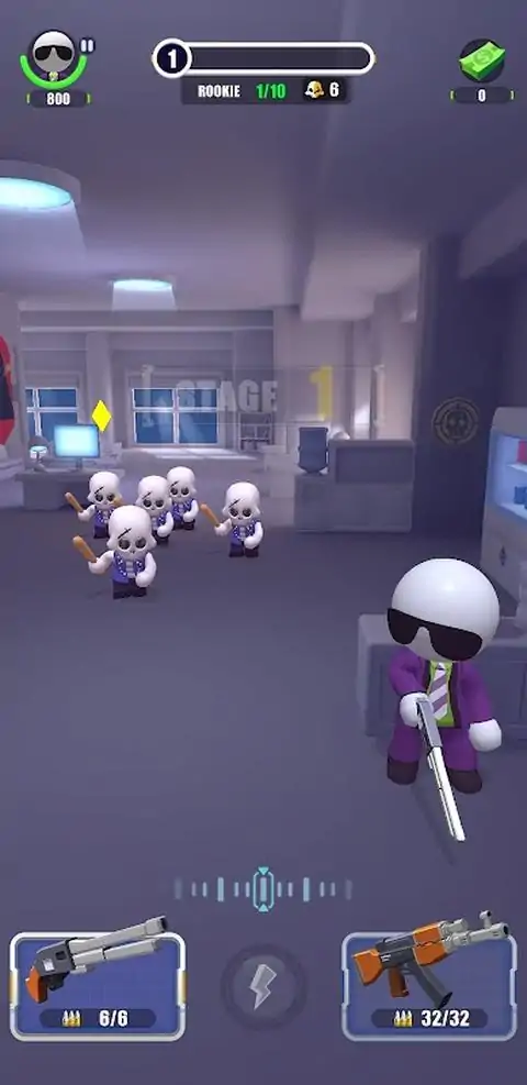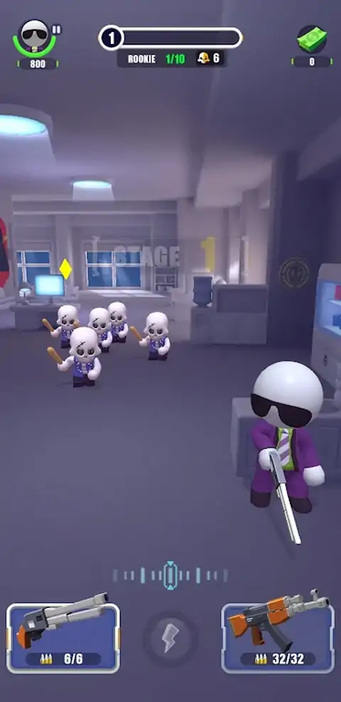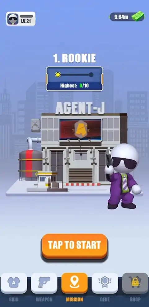 玩家扮演熟练的秃头特工,通过单击向敌人射击并击败所有敌人以通过关卡。每次击败敌人,玩家都可以获得金币奖励