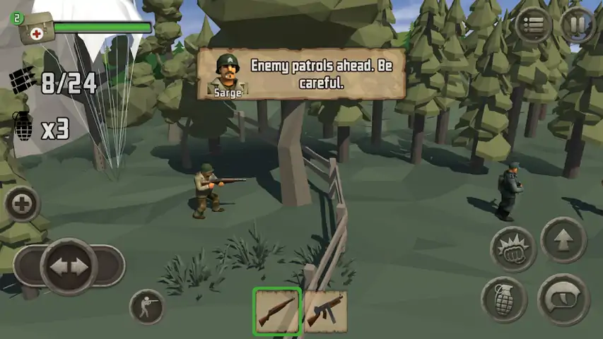 你是士兵。您的任务是保持枪支装满并穿过战场上的敌军。武器您拥有传奇的WW2武器:M1加兰德步枪和汤普森冲锋枪!使用毁灭性的喷火器!使用火箭筒和手榴弹在敌对领土上爆炸!靠近并与您的战斗刀战斗!特征潜伏在敌人身后,使其安静地失效!穿过铁丝网围栏!使用Medipacks保持士兵们前进!收集弹药,手榴弹和新武器!当心隐藏的狙击手!穿越致命的雷区
