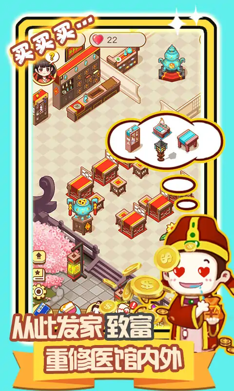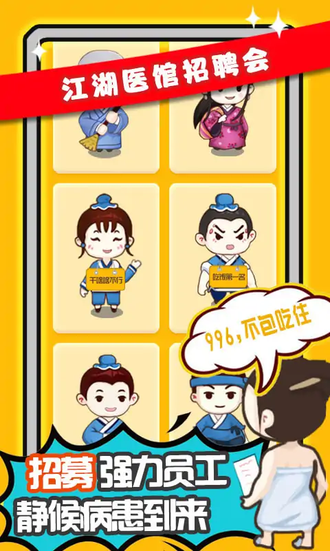 “江湖医馆的金馆长带着他的女徒弟跑啦Σ(⊙▽⊙"a 面对师父留下的债务和债主手中的棍子,你只能选择重开江湖医馆治病还钱_(:з)∠)_。 【努力研究新病症】 想了想,跟着师父就只学了治流鼻血,但光靠这个可没法还债。还好师父的医书全部留在了你这里,天赋异禀的你只要学会治疗更多新病症,就能赚到更多的钱还债了! 【重新修建破医馆】 由于师父欠债跑路,愤怒的群众们搬走了医馆里的设施抵债,只留最后一张桌子。看着空荡荡的医馆,你决定拿出一部分诊金重建医馆,但是为了避免再次被追债,请合理使用诊金。 【三教九流来求药】 人在江湖飘,哪能不看病?方圆百里就你一家医馆,市井百姓、江湖人士都得来你这儿看病,完成他们的心愿或请求,也许能获得意想不到的收获。 【秘方残卷需收集】 偶尔有奇人异士或者收废品的上门,会带来一些残破的医术秘方,收集这些秘方,可以让你在某个疾病领域更进一步,这样可以赚更多的钱,早日还债。 【招募员工创辉煌】 随着医馆逐渐步入正轨,你逐渐觉得力不从心,看了看账簿上的收支,你决定去招募几个员工回来,一起创造医馆的美好未来。