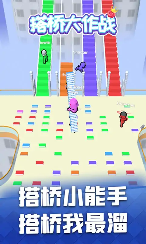 《搭桥大作战》是一款休闲益智类手游,玩家在搭桥大作战游戏中需要不断拾取地上的进行桥梁的搭建,玩家与玩家之间的对抗,安全抵达游戏终点。搭桥大作战游戏设置了丰富的游戏关卡和精彩的游戏内容,玩家只需动动手指即可轻松过关。 游戏特色: 1、你可以改变人物的肤色,让你自己为这场竞速比赛当中,最亮的仔。 2、充满了无尽的乐趣体验,可以解锁更多有意义的人物,开启冒险。 3、多名玩家争夺冠军名号,具有挑战性。
