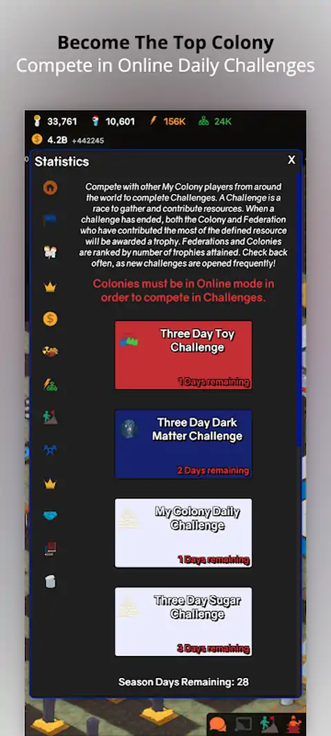 建立、扩张并统治你的太空殖民地。解锁科技,交易资源,发展帝国。 建立、扩张、统治星系。 欢迎来到《我的殖民地》——终极太空殖民与模拟帝国建造游戏。从一个登陆器和探测车开始,打造一个横跨星球的星际文明。 • 收集资源,解锁科技树:建造、升级、探索数百种结构和单位。 • 四大文明任你选择:地球联邦、独立联盟、佐拉格帝国(昆虫族)、阿尔法卓克人(爬虫族),每个都有独特科技与玩法。 • 单人/多人模式自由切换:沙盒城市、连通区域地图、多人合作城市建设,甚至还有“独立战争”和玩家间的联邦系统。 • 全球实时贸易系统:加入银河贸易局,参与玩家拍卖和资源市场。 • 挑战极限管理:优化人口、GDP、教育、健康、安全等指标,打造最强殖民星球。