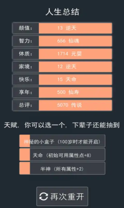 《人生重启模拟器》是一款(文字)+(模拟)类型的游戏,游戏里的一切都是随机发生的。你将随机出生经历从0岁开始慢慢长大成人,打工创业,娶妻生子,终老病死,甚至是你平常你敢想而不敢做的事儿都可以体验。你的性别、天赋擅长都是随机的,只有你在选择天赋的时候可以改变。其中包含:颜值,智力、家境、体制,游戏可以体验无数次,也会产生无数次不同的结果,让你感悟不同的人生。