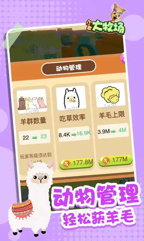 玩家在游戏中扮演一个牧场主,放牧萌萌哒的羊驼,收剪并出售羊毛,赚到开办工厂的费用,不断升级工厂和牧场,实现成为大牧场主的梦想!
