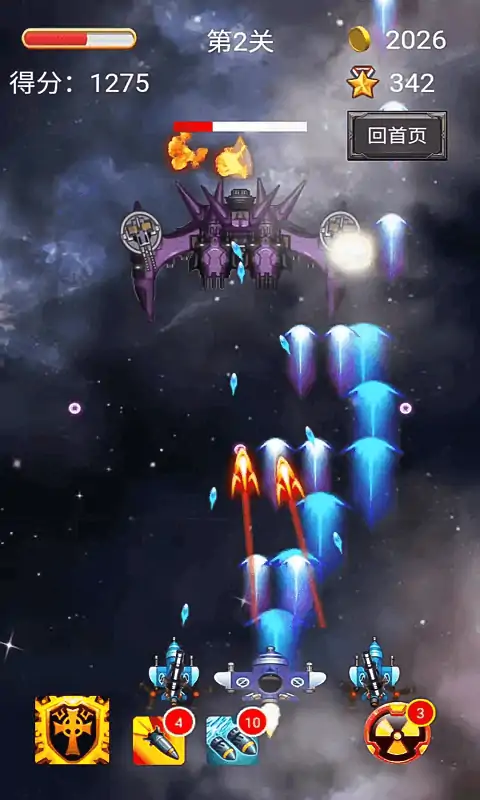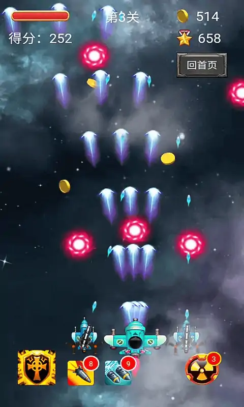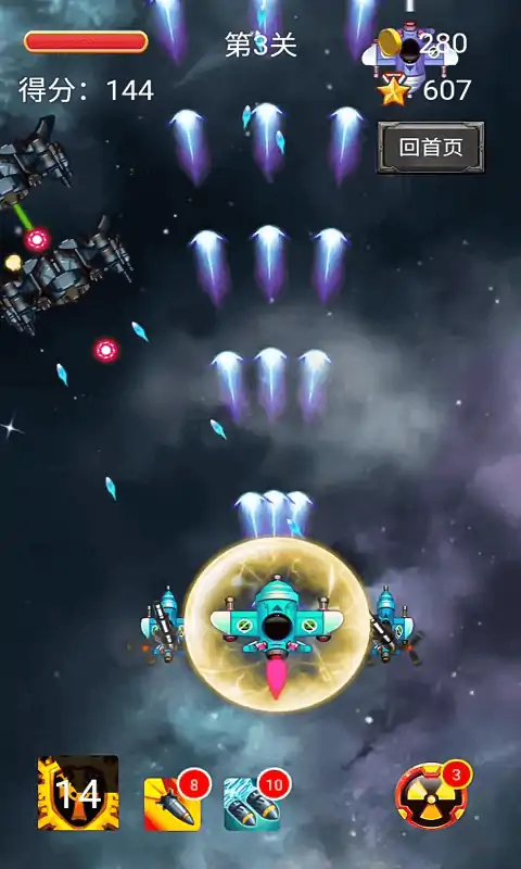 精美绚丽的画面,整体环境围绕太空为主,高保真的音效,为玩家呈现一场不一样射击体验。简单的触屏操作,触屏按住随意一个地方,左右移动,便可自动攻击敌人,上下移动亦可躲避强敌。在飞机的下方还有道具槽,直接点击就可以发动道具效果,前提是你必须要吃到道具。玩家在游戏中要做的就是驾驶着最新战机,向敌人的总部发起了冲击。除了传承经典的飞行射击类元素之外,同时还加入了商店系统,通过购买相关配件和物品升级武器和飞机。另外还有装备系统,可以让你的飞机变得更强悍,替换相关配件让你火力全开。