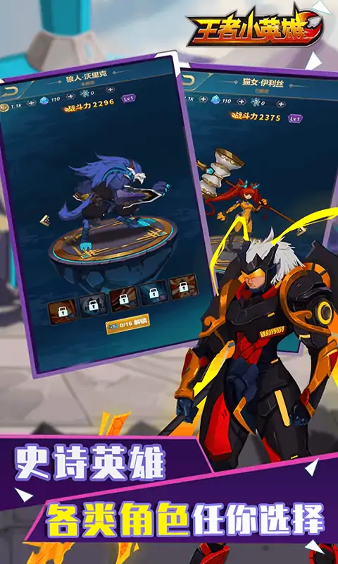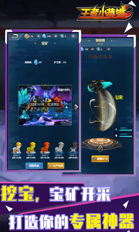 《王者小英雄》是一款休闲竞技游戏,游戏中可以解锁各种英雄角色,开采矿石打造专属武器,助力排位上分!丰富副本关卡,精彩英雄竞技对抗,挑战世界首领,多样玩法;培育特色英雄,打造专属神器,成就最强王者! 扮演角色: 猫女·伊利丝,战神·吕奉先,狼人·沃里克,天神·后羿 主要情节:时空隧道发生破裂,不明虚空生物入侵塞尔大陆,霸占能源宝矿,此时应时空隧道破裂意外来的这片大陆的英雄出现了,他们击败虚空怪物,夺回被侵占的宝矿资源,让大陆重新恢复平静。 玩法: 竖版回合竞技游戏。玩家培育自己的英雄,打造英雄专属武器,挑战关卡,世界boos,与其他玩家培育角色竞技对战,通过不断战斗获得资源和段位与名次的提升,目标是最强王者。 功能(系统): 角色养成,武器打造,抽奖签到系统,矿山采集,战斗系统,世界boos,赛季/排行榜,补给系统 主要特点: 游戏休闲简单易上手,简单一只手动动手指就能操作整个游戏,随时随地放松娱乐 各角色特点鲜明技能炫酷,每位角色可打造多种专属武器,搭配5种特效炫酷的技能,给玩家一个炫酷多彩的游戏体验。 打造各个角色的专属武器 回合的战斗机制,给予玩家相