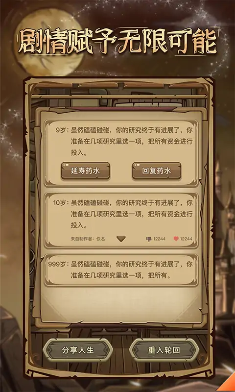 《魔幻异世转生模拟器》是一款Roguelike人生模拟文字冒险游戏。在游戏中,玩家可以体验不同的魔幻异世人生,并且通过不同的天赋属性来丰富异世的冒险旅程。 进入转生之前,玩家可根据自己的需要选择最少三条天赋,并且分配20点基础属性点给力量、智慧、体质、家庭四个基础属性。每个属性数值的高低,会在游戏中得到不同的发展。以四个基本属性为依托开展剧情,为玩家的剧情属性:等级、敏捷、魅力,提供剧情来源。属性值越高,所触发的剧情就会越精彩。 同时魔法世界还加入了体力玩法,玩家每一年都会获得100点体力,当到达不同小岛或大陆的时候,玩家经历的剧情会消耗对应体力值,直至体力消耗完全,当年的剧情结束进入下一年。体力值的加入让玩家能够更加真实的体验到魔幻的的历练。 每一局游戏的结束,将会回馈给玩家对应的元灵点数,用来升级玩家的灵魂,灵魂每升一级,可获得一点可分配的属性点,玩家可将属性点永久分配给四项基本属性。使玩家的每一剧游戏成果变得可视化,每一次的转生不在是一成不变。 游戏世界由四块大陆及无数个岛屿组成,上百名玩家写手共同搭建而成,你观看的不仅仅是剧情,更是一场头脑风暴的内卷。可视化编辑器的开发,摆脱了