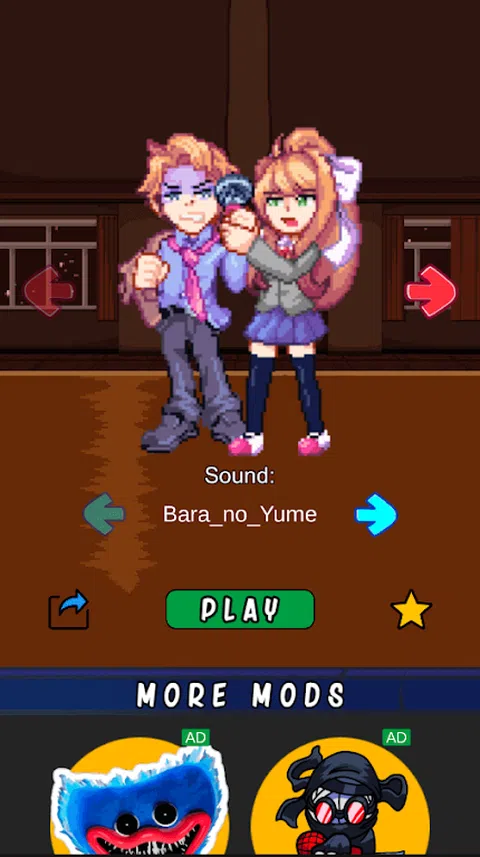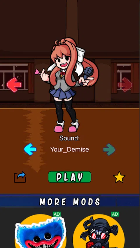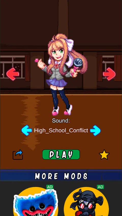 Monika是星期五夜间Funkin的Mods之一。在FNF Monika Mod测试中,您必须控制这个非常英雄。这个角色是Doki Doki文学俱乐部小说的主角和主要敌人。 Monika拥有非常长的棕色头发,她拉回了主持人和大绿眼睛。她穿着典型的校服:白衬衫,灰色夹克,深蓝色裙子,黑色紧身裤和白色鞋子。在她的一个Mods中,Monika与Senpai的麦克风打架,他也穿着他的典型校服男生。 你应该在FNF Monika Mod测试游戏中做些什么?您需要与主角一起,通过单击您的设备屏幕上的箭头来评分最高点!在开始游戏之前,选择最佳的曲目,然后单击“播放”。之后,在FNF Monika Doki Doki文学俱乐部测试角色,主角和四个箭头将出现在屏幕上,您将控制英雄。只要您单击箭头,该角色将唱一定的票据并进行一定的运动。如果您只想听到Monika的声音,您可以关闭背景音乐。为此,您需要在设备屏幕上按下蜂鸣声