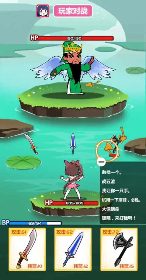 斧头互怼是一款新颖的1v1竞技游戏。游戏分为左、中、右三路,每路有对应的武器,需要的能量也不一样,你需要选择是跟对手硬杠一路,还是利用自己的优势全面进攻!有点田忌赛马的感觉。 竞技场里,玩家还可以选择跟其他玩家进行单挑,获得怼人段位。你能到王者吗?