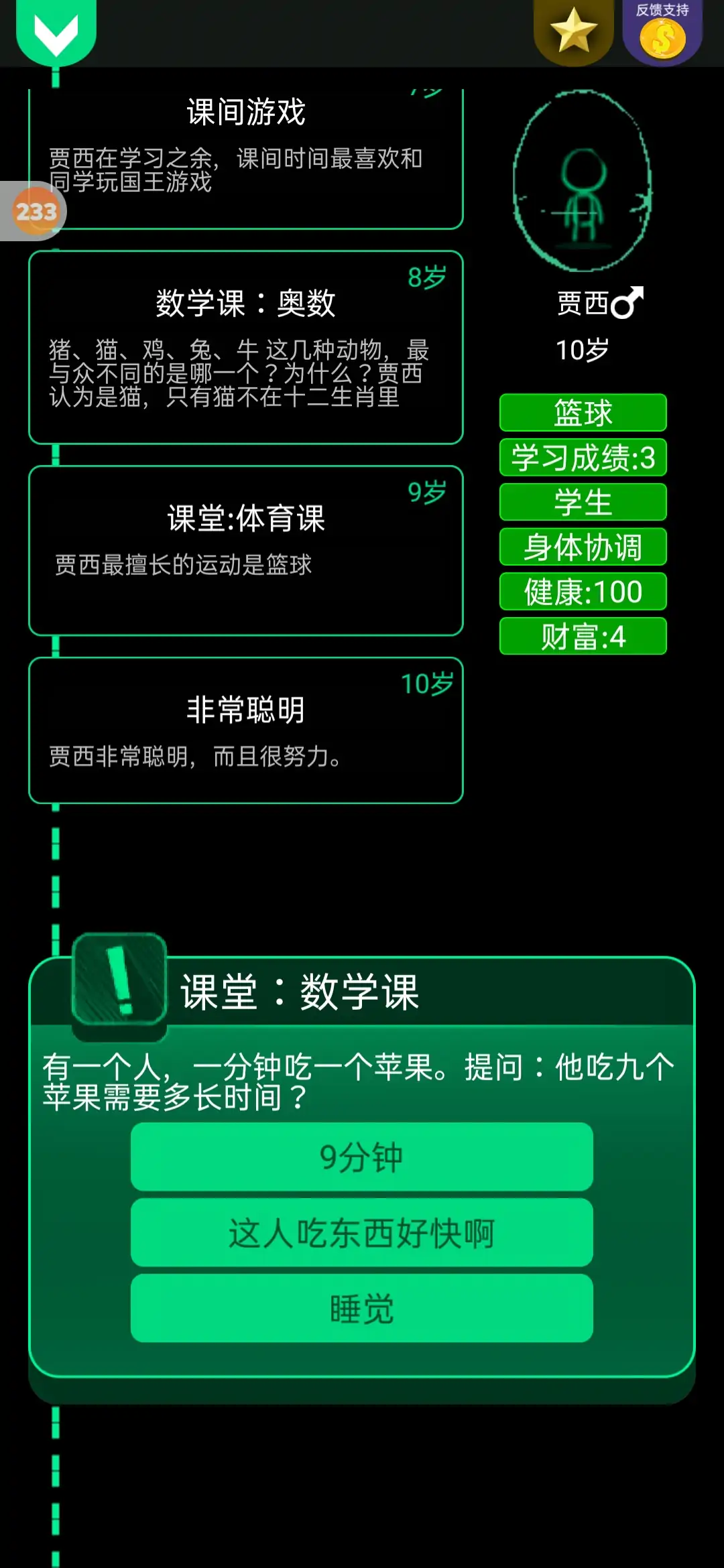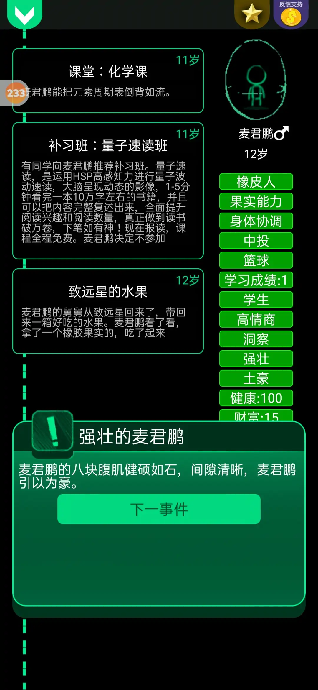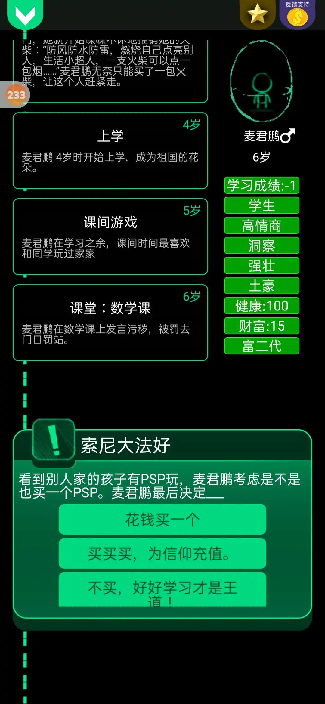 《逗比人生年度版》是一款十分有趣的休闲游戏。游戏中,你需要对游戏人物的一生各种事件做出选择,所有的随机事件,都是由玩家贡献。故事每天都在增加,如果你有什么好的故事也可以提出来,会被制作成故事内容!喜欢的玩家下载试试吧!