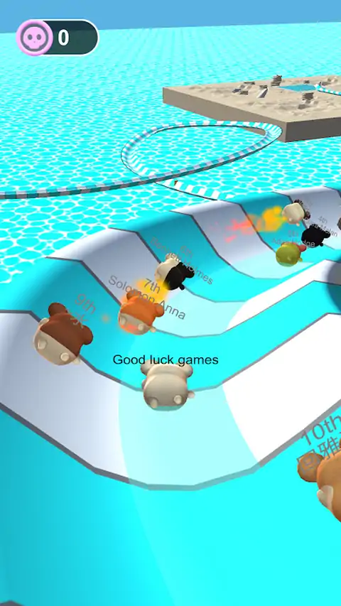 刺激乐趣的水上乐园游戏。 简单而有趣的游戏速度。到达目的地后立即赢得奖杯和金币。 操作:将对手推出轨道或跳动轨道寻找快捷方式,但是当你跳上水道时,请小心地进入水中。 得分:推动你的对手走出轨道将赢得更多的硬币