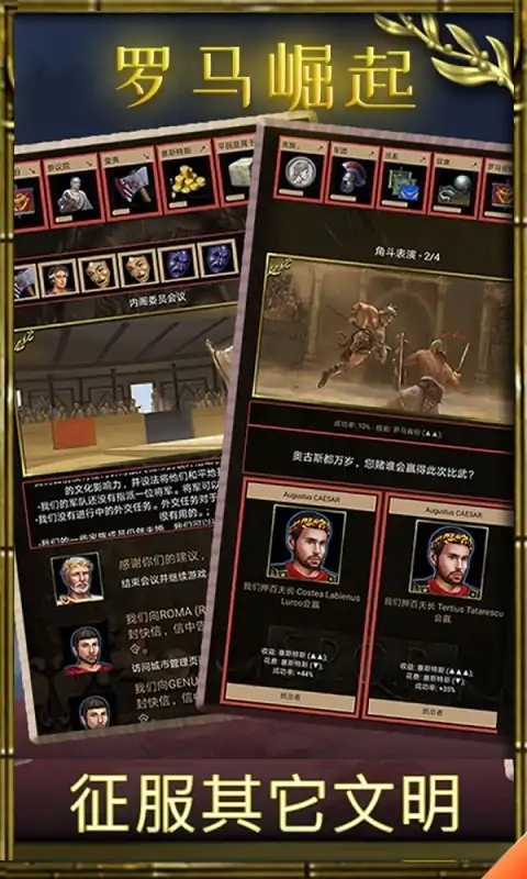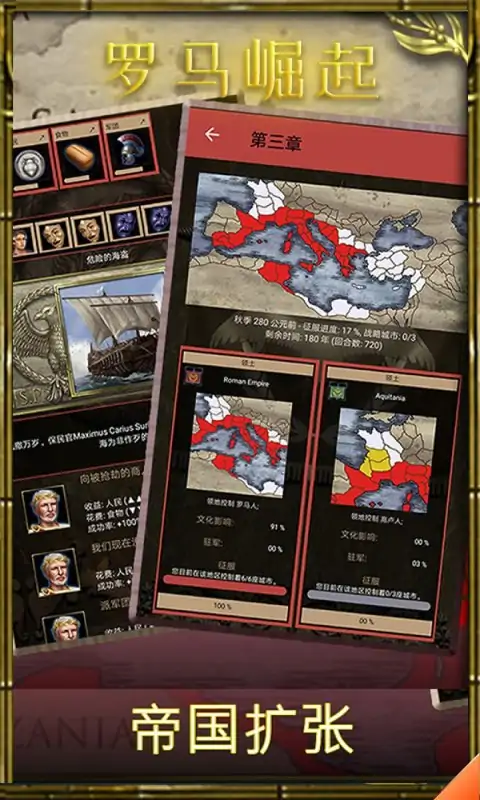 这是一个以罗马发展史为背景的回合制征服类和策略类游戏。世界在等待着您,罗马等待着您。将罗马从意大利半岛中心的一个小城邦发展成为一个横跨亚非欧大陆伟大文明。带领军团与其它向罗马帝国发动战争的王国或文明展开史诗级战斗。升级帝国防御,以抵御敌对文明的武士攻击,敌对文明的武士会围攻罗马,企图推翻您的王国。历经重重历史挑战(帝国分裂致使罗马政权动摇):阴谋与背叛、战争和蛮夷入侵、暴动和政变。 游戏特色 -回合制策略游戏:在每一个游戏回合中追溯罗马历史上最重大的事件,运用最佳策略来治理帝国。 -王朝和人才:治理帝国,引领您所在的王朝走向繁荣,阻止罗马共和国的建立。教会您的继承人从战略和战术上选拔人才,训练将来的君主成为一名伟大的征服者和一代传奇帝王。 -城市管理:通过修建帝国广场、罗马竞技场、渡槽、用于供奉罗马诸神的万神殿、皇家别墅和防御工事来壮大城市。-战斗模拟:指挥古欧洲军队,带领他们进行史诗级的战斗。运用军事策略和战术领导军队征服敌对文明,扩张领土。