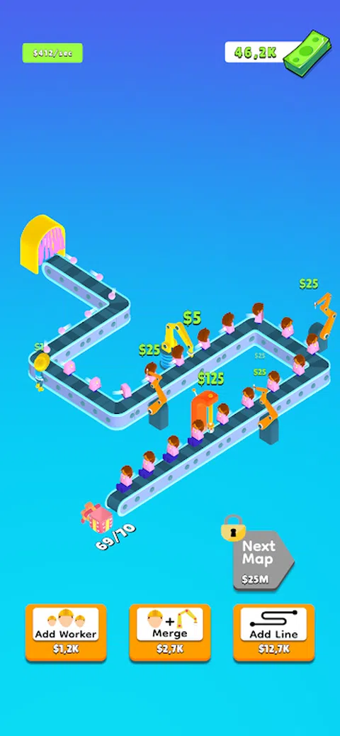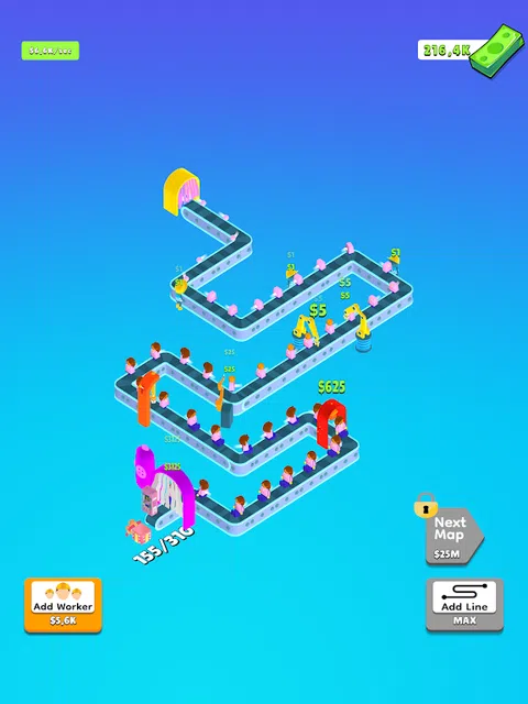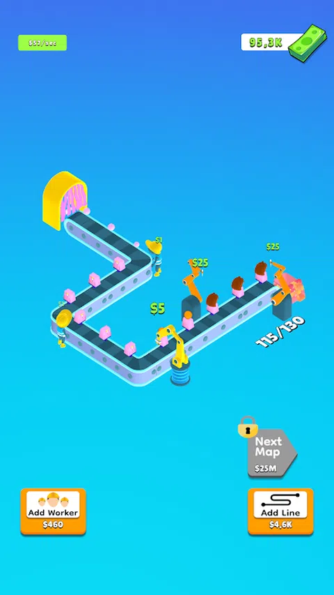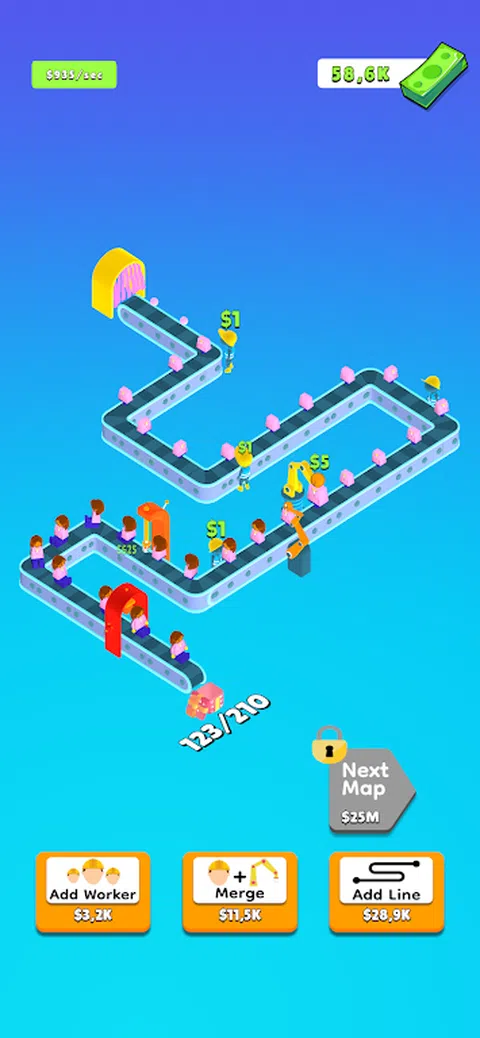 开始单击以建造大型生产线! 管理庞大的生产线!合并机器并延长生产线以赚取更多的钱